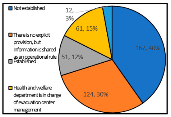 Figure 16 shows the status of information sharing with the health and welfare department. As a result, there are some local governments have centralized information because the health and welfare department is in charge of shelter management. Comparing with Figure 10, about 100 local governments did not stipulate information sharing with the disaster response headquarters (Figure 10), more than 150 local governments have not stipulated information sharing with health and welfare departments, indicating that the information-sharing system has not been developed. Since cooperation with health and welfare departments such as shelter assessment and supply of supplies is considered to be essential for maintaining the health of disaster victims, it can be said that there is an urgent need to develop an information-sharing system.