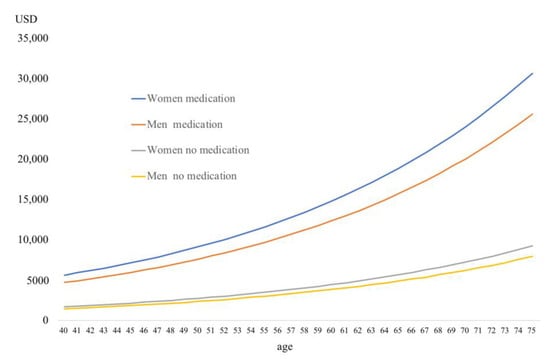 Figure 1 shows that 5-year cumulative medical expenditure was high for women taking medication, about USD 5642 (JPY 589,515) for women 40 years old and about USD 30,694 (JPY 3.2 million) for women 75 years old. On the other hand, for women not taking medicine, the expenditure was about USD 1698 (JPY 177,377) for women 40 years old and about USD 9235 (JPY 965,011) for women 75 years old.