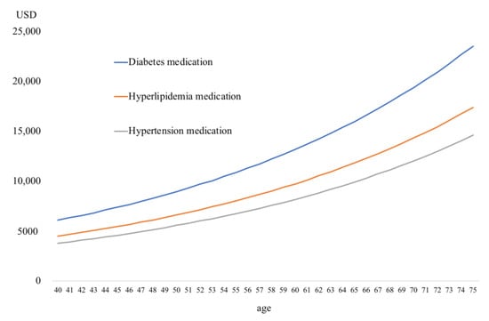 Figure 2 shows 5-year cumulative medical expenditure for men by medication type. There was no significant difference in medical expenditure. Medical expenditure for diabetes medication was the highest at about USD 6093 (JPY 599,715) for men 40 years old and about USD 23,533 (JPY 2.5 million) for men 75 years old.