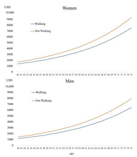 Figure 3 shows 5-year cumulative medication expenditure for subjects without medication by walking habits. Men with walking habits had the lowest medical expenditure, at about USD 1184 (JPY 123,764) for men 40 years old and about USD 6444 (JPY 673,335) for men 75 years old.