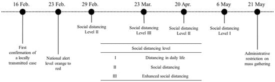 Since the first COVID-19 case was confirmed on 20 January 2020, every individual in close contact with a confirmed case was screened and quarantined to prevent local transmission. At that time, all confirmed cases were those who had entered Korea from other countries or were in close contact with previously confirmed cases. Since 16 February, the locally transmitted cases were continuously discovered, especially in Daegu and Gyeongsangbuk-do provinces. The Korean government has been implementing social distancing strategies (Table 1) in several stages, considering the number of confirmed cases and economic situations. On 29 February, the KCDC recommended the public practice of social distancing until the beginning of March (level II). The social distancing level was raised to level III from 22 March until 20 April. Social distancing policy level III, which restricts daily socioeconomic activities, was not sustainable for the long term and affected the economy. Social distancing level III was terminated on 20 April and lowered to level I, allowing the usual daily socioeconomic activities from 6 May.