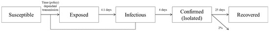 It is known that the incubation period of SARS-CoV-2 is 1–14 days []. According to the KCDC report, the average incubation period is set to 4.1 days []. Thus, the rate of progression from exposure to infectious individuals is assumed to be 1/4.1 days−1. The average period of moving from an infectious to a confirmed case is 4 days; the rate of confirmation is 1/4 days−1 []. It is assumed that the confirmed cases are totally isolated and would not infect others. The isolated patients are discharged after an average of 25 days. In other words, the averaged recovery rate is 1/25 days−1 in this model. As of 15 July 2020, 289 cases were deceased among 13,551 confirmed cases. The fatality rate is approximately 2%.