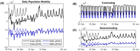 Daily population mobility data from 16 February to 30 June. (A) Total population mobility; (B) daily commuting; (C) daily noncommuting.