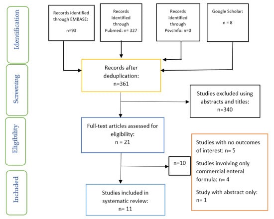 Pubmed, EMBASE, PSYCInfo and Google scholar were the databases searched for articles of interest using keywords, Medical Subject Heading (MeSH)/synonyms and Boolean operators (AND/OR). The searches were conducted from the commencement of databases until 23 July 2020. Keywords were combined as follows; Enteral nutrition OR Blenderized formulas OR nutritional support OR home enteral nutrition OR enteral formula OR Enteral feeding OR blenderized enteral formula OR blended feeds OR Blenderized home-made food AND microbial contamination OR bacterial contamination. The strategy used for searching relied on the Population or Problem, Intervention, Comparator, Outcomes—PICO framework [31].