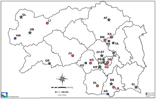 Map of Styria, Austria with the measuring locations [23] (Edited by A. Kriso). The sym-bols urban “