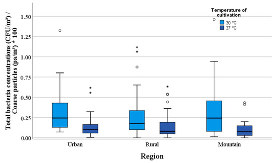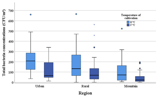 In the mountain regions, the median values of the total mesophilic bacterial concentrations for the eight measuring sites were 7.1 × 101 CFU/m3 and 2.3 × 101 CFU/m3 for the cultivation at 30 °C and 37 °C, respectively. The values in the mountain regions were below the median values obtained from the eight rural (1.3 × 102 CFU/m3 and 6.9 × 101 CFU/m3) and nine urban (2.1 × 102 CFU/m3 and 6.5 × 101) locations (Table 1). At 30 °C, the mesophilic bacterial concentrations in the rural and urban regions were twice and three times higher than in the mountain regions. The results of cultivation at 37 °C for the samples from rural and urban regions were three times higher than the median values of the mountain regions. The highest median of the three geographic areas was obtained in the urban regions. Figure 2 shows the total mesophilic bacterial concentrations at 30 °C and 37 °C for cultivation of the three regions.