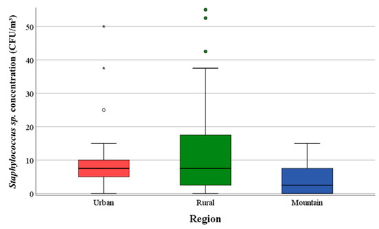 The median value for concentrations of Staphylococcus sp. was 3.0 × 100 CFU/m3 at the eight measuring sites in the mountains. This value is significantly (p < 0.001) lower than the values of the eight rural and nine urban locations. Figure 3 shows the Staphylococcus sp. concentrations of the three geographic regions.