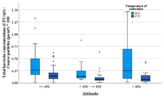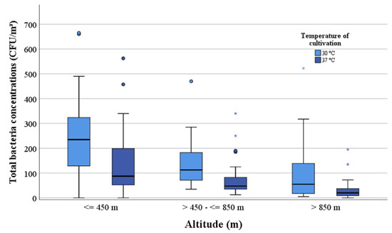 The median values of the total mesophilic bacterial and Staphylococcus sp. concentrations are listed in Table 1 in relation to altitude and weather conditions. Higher median values of the total mesophilic bacteria and Staphylococcus sp. were found at an altitude below 850 m (Figure 4 and Figure 5). The concentrations of staphylococci decreased with increasing altitude and no staphylococci could be detected above an altitude of 1200 m. The correlations between the total mesophilic bacterial concentrations (30 °C) or the Staphylococcus sp. and altitude were negative (rho = −0.48 and −0.34).