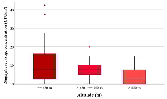 Comparison between the concentrations of Staphylococcus sp. (CFU/m3) and altitude (m).