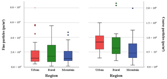 In the three investigated regions, the number of fine particles (0.35–2.3 μm) ranged from 7.98 × 105 to 8.02 × 107 pa/m3 and of coarse particles (>2.3–10 μm) from 5.48 × 103 to 9.94 × 104 pa/m3, respectively (Table 2). The fine particle numbers in the rural regions were 1.2 times higher than in the urban areas and 1.1 times higher than in the mountains. The highest concentrations of fine particles were found in the rural regions. The coarse particles showed differences in the concentrations between the urban, rural and mountain regions. While the median values in the rural regions were 1.4 times higher than those of the mountain regions, the median value in the urban area was twice as high as in the mountain regions. The lowest median value was found in the mountain regions (Figure 6).