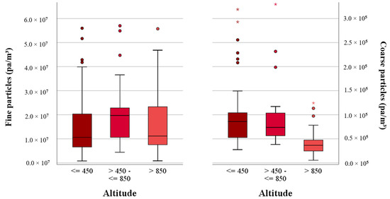 In Table 2, the median values of the dust particle numbers are shown in Table 2 in relation to altitude and weather conditions of sun, clouds and wind velocity. Higher median values of the fine particle concentrations were found between >450 m and ≤850 m altitude. The highest numbers of coarse particles were found in an altitude <450 m with a value of 8.58 × 104 pa/m3. The lowest fine and coarse particle numbers were detected above an altitude of >850 m (Figure 7). No correlation was found between fine particles and altitude. The correlation between coarse particles and altitude was negative (rho = −0.39).