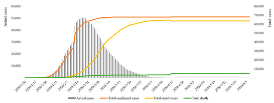 The COVID-19 case data was taken from the Health Commissions of Hubei Province and cities, with details including the total number of confirmed cases, daily new cases, cured cases, and deaths from January 10 to June 5, 2020. The daily actual cases were calculated by subtracting the total cured cases and the total deaths from the total confirmed cases.