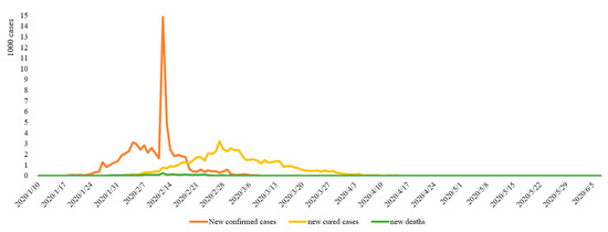 The earliest case of COVID-19 in Hubei Province can be traced back to December 8, 2019. However, due to the small number of infections and similar symptoms to flu, it did not attract attention in the initial stage. The earliest notification on COVID-19 issued by the Wuhan Municipal Health Commission was on December 31, 2019, when 27 confirmed cases were announced. Overall, from January 10 to June 5, 2020, the total number of confirmed cases of COVID-19 in Hubei Province increased from 41 to 68,135, the total number of cured cases increased from 2 to 63,623, and the total number of deaths increased from 1 to 4512. The number of actual daily cases increased from 38 to the peak of 50,633 on February 18, and then gradually reduced to 0 on April 26, thereafter entering the zeroing phase (Figure 2). In terms of the rate of change, the highest number of new cases per day was 14,840 on February 12; the highest number of new cured cases was 3203 on February 27; and the highest number of new deaths was 242 on February 12 (Figure 3).