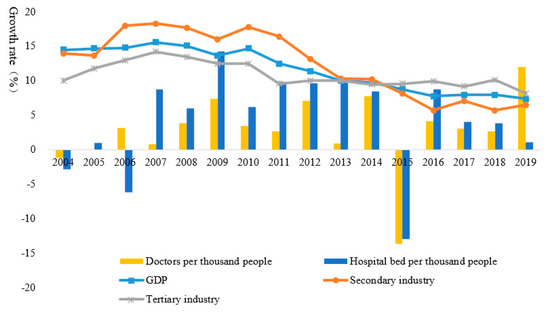 The urbanization rate of each city in Hubei Province in 2019 is shown in Figure 4. As the provincial capital, Wuhan has the highest urbanization rate of 80.49%. Ezhou is ranked second with an urbanization rate of 66.3%, and Huangshi’s urbanization rate is 61.7%. With the exceptions of Huanggang, Enshi, and Shennongjia, the urbanization rates of other cities exceed 50%. Taking Wuhan as an example, in terms of the urbanization pattern from 2004 to 2018, although its GDP, and secondary and tertiary industries showed a downward trend, they are nonetheless higher than the growth rates of doctors and hospital beds per thousand people (Figure 5). It can be seen that the focus of Wuhan’s urbanization model is economic growth and industrial development, whereas the improvement of basic public services such as medical care has relatively lagged behind. This laid a foundation for the huge losses caused by the outbreak of COVID-19.