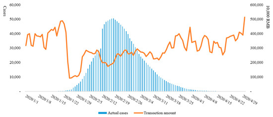 In summary, from the experience at home and abroad, cities are not only hotbeds of epidemic diseases, but also the battlefields of epidemic prevention and control [25]. Research on urbanization and its problems in various countries provides useful references for understanding the general laws of urban development, but the issue of urbanization in China requires special attention due to its own characteristics. China’s research on urbanization and its problems mainly focus on environmental pollution [31,32,33,34,35,36,37], traffic congestion [38,39], or spatial economic differences [40,41], whereas analysis of public health emergencies in cities is insufficient. The current research on COVID-19 in China has mostly analyzed the evolution of the epidemic, or discussed its economic impact at a macro level, but has not studied its impact from the perspective of urbanization. Thus, taking Hubei Province, the region with the most COVID-19 cases in China, as an example, this study focused on three key concepts, namely, COVID-19, urbanization, and economic recovery. The study used China UnionPay transaction data to analyze the economic trends of Hubei Province under the interactive influence of the current urbanization pattern and COVID-19. The aim was to provide ideas and references for its economic recovery and high-quality urbanization in the post-epidemic period.
