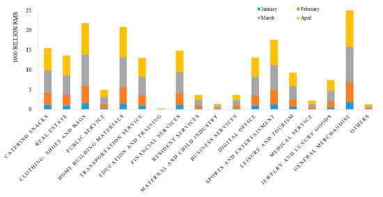 During the spread of COVID-19, there was significant industry heterogeneity in transaction trends (Figure 7). In terms of volume, from January to April in 2020, the industry with the largest transaction volume in Hubei was general department stores, followed by clothing, shoes and bags, home building materials, cultural, sports and entertainment, catering and snacks, and financial services. Medical services ranked fourth from the bottom among 18 categories, and education and training was ranked last. The highest ranked transaction amount of general department stores is consistent with the situation that residents’ consumption was mainly to meet the requirements of daily life under the condition of home isolation. Large transaction volumes in recreation, sports, and catering and snacks reflect that people spent a significant amount of their leisure time on audio-visual entertainment, reading, cooking, home fitness and other activities during the period of home isolation and suspension of work. Increased financial service transactions may be a manifestation of people’s increased demand for personal and medical insurance. The lower consumption of medical services may be a reflection of the reduced demand for medical care due to concerns about the high risk of infection in hospitals during COVID-19. The transaction volume of education and training was the lowest, reflecting the significant impact of home isolation on education and training during the epidemic period.