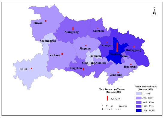 Finally, by comparing the total monthly transactions and cases in cities of Hubei Province, we can clearly see the differences in the spatial distribution of COVID-19 and the economy (Figure 8). In terms of the spatial distribution of transaction volumes, although COVID-19 had a significant impact on Wuhan’s economic activities, due to its larger population compared with other cities, Wuhan’s transaction volume remained the highest from January to April, reaching RMB 125.63 billion, accounting for more than one-third of the whole province. This was followed by Xiangyang, Jingzhou, Yichang, and Huanggang, whose total transaction volumes from January to April were RMB 38.402 billion, RMB 34.801 billion, RMB 27.484 billion, and RMB 24.959 billion. The total transaction volume generally presents an inclined triangle pattern, with Wuhan, Xiangyang, and Jingzhou as the three vertices. The transaction volume was high in the east, low in the west, and extremely low in other areas. The spatial distribution of total cases in Hubei Province was roughly characterized by being high in the northeast and low in the southwest, high in the north and south, and low in the middle. Thus, the spatial differences between COVID-19 and the economy reflect that differences exist between the influencing factors of epidemic spreading and economic development. In the early stage of the outbreak of the epidemic, geographical proximity was the main factor affecting the spatial distribution of cases. However, after implementing lockdown policies and home isolation, the influence of geographical proximity was reduced, and the urbanization level of cities became the key factor influencing epidemic control and economic recovery.