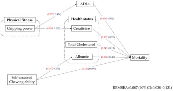 - Nomura, Y.; Kakuta, E.; Okada, A.; Otsuka, R.; Shimada, M.; Tomizawa, Y.; Taguchi, C.; Arikawa, K.; Daikoku, H.; Sato, T.; et al. Impact of the serum level of albumin and self-assessed chewing ability on mortality, QOL, and ADLs for community-dwelling older adults at the age of 85: A 15 year follow-up study. Nutrients 2020, 12, E3315. [Google Scholar] [CrossRef] [PubMed]
