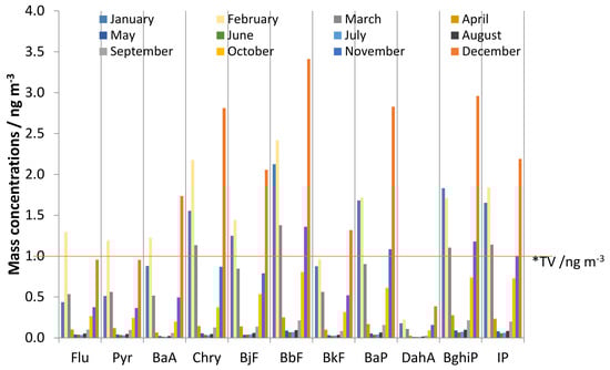 - Jakovljević, I.; Pehnec, G.; Vadjić, V.; Šišović, A.; Davila, S.; Bešlić, I. Carcinogenic activity of polycyclic aromatic hydrocarbons bounded on particle fraction. Environ. Sci. Pollut. Res. 2015, 22, 15931–15940. [Google Scholar] [CrossRef]