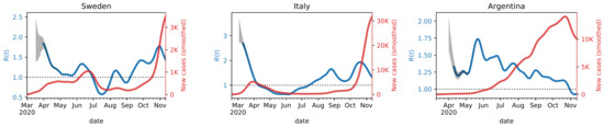 The three countries in Figure 1 are characterized by a different evolution of the epidemics. Sweden had a long first wave that peaked in the middle of June and the second wave started when the first one was not completely over. This is reflected in the estimated , which stays for a long time interval above 1. Italy had a first wave stronger than other countries, that was brought down completely due to the lockdown. The estimated starts from very high values and quickly goes below 1 by the beginning of April. Finally, the number of new cases in Argentina kept growing very slowly, but consistently, until the middle of October and there are no two distinct waves as in many other countries. Consequently, the is characterized by values that are slightly above 1 until the beginning of November.