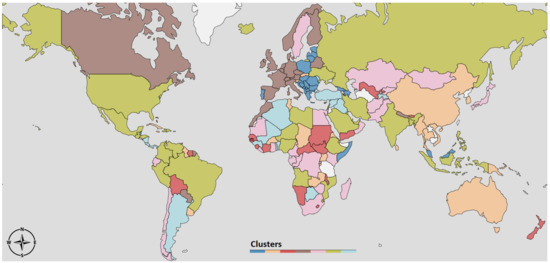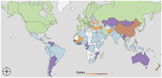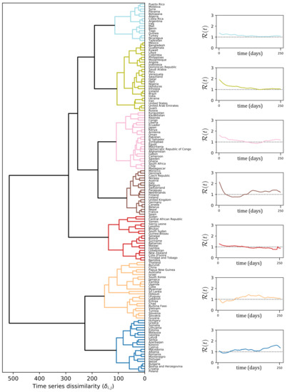 The dendrogram to the left of Figure 3 depicts the result of the clustering procedure, based on the DTW dissimilarities between the -curves estimated according to Equation (9). In particular, the dendrogram illustrates how two leaves i, j (i.e., the -curves of countries i and j) are merged together as soon as the threshold becomes larger than their DTW dissimilarity value . There is no unique way of selecting an optimal , but it rather depends on what level of resolution of the clustering partition is amenable for a meaningful exploration of the structure underlying our data. In our case, we selected a that gave rise to seven clusters, depicted in different colors in Figure 3. On the right hand side of Figure 3, we report averaged over all the countries in the same cluster. To facilitate the interpretation of the results, in Figure 4 we depict the same clustering partition obtained for on the political world map.