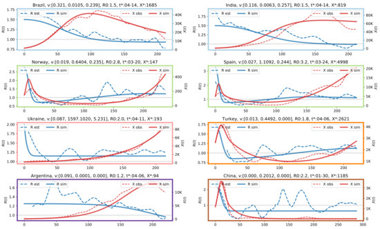 The partition contains six clusters and the largest ones are the azure and green clusters, containing mostly northern and southern countries, respectively. In Figure 7 we analyze in detail representative countries from each cluster, using for the graph borders the same color coding of Figure 6. Each graph in Figure 7 depicts the reported daily new cases (dashed red line), the daily new cases simulated by the oscillator model (solid red line), the curve estimated using Equation (9) (dashed blue line), and the curve simulated by the proposed close model (solid blue line). On the top of each graph, we report for each country the fitted values of , , , the initial , and the date that identifies . On the horizontal axis, 0 corresponds to , the left vertical axis indicates the value of the reproduction number, the right vertical axis indicates the number of new daily cases. In the Appendix A, we report a visualization of in the different World countries, which can be interpreted as an estimate of the onset of the social responses.