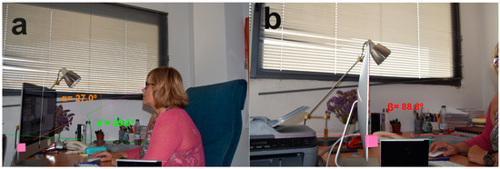 For the ergonomic evaluation, the workers were instructed to sit in a normal working posture and look at the screen. The viewing distance between the worker’s eyes and the centre of the screen was measured, and neck posture (neutral or altered) was analysed by direct observation of the worker according to standards [19]. Two photographs were taken with a Nikon D3300 camera, one from the sagittal plane of the seated worker and another from the plane perpendicular to the VDT (Figure 1a,b, respectively). Subsequently, the following were calculated using the software Qcad Trial 3.19.2 [20]: the eye to screen angle (α) formed between the horizontal from the eye and the line joining the eye with the lower centre of the screen; the vision angle (α′) formed by the last line described and the line perpendicular to the screen; and the screen tilt angle with respect to the horizontal (β).