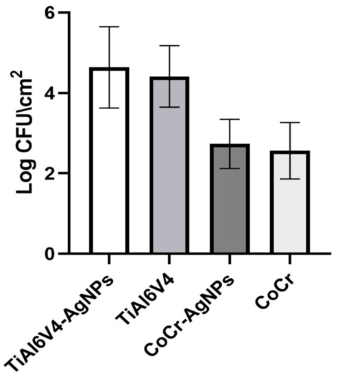 The results of the population density determination, obtained by analyzing eight coupons by the type of material, showed a Log bacterial density (Log CFU/cm2) equal to 4.41 ± 0.76 on TiAl6V4 coupons and 4.63 ± 1.01 on TiAl6V4-AgNPs coupons. Lower values were found on CoCr coupons, respectively equal to 2.57 ± 0.70 on CoCr and 2.73 ± 0.61 on CoCr-AgNPs (Figure 1). This difference was statistically significant. The P-value obtained by ANOVA one-way test was <0.0001, and results obtained by Holm-Sidak’s multiple comparisons test were significant between titanium and chromium-cobalt (<0.0001), but not significant between the same material coated and not coated (>0.92).