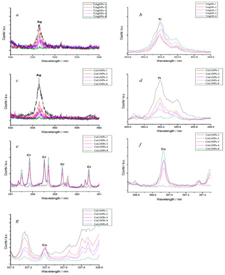 Insets of Laser Induced Breakdown Spectroscopy (LIBS) spectra relative to Ag (a) and Ti (b) in TiAl6V4-AgNPs coupons and Ag (c), Ti (d), Cr (e), Co (f), Cu (g) in CoCr-AgNPs coupons. Sample numbering indicates the progressive order by which the analysis was made by repeatedly shooting the laser on the same point.
