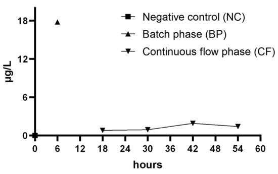 The AgNPs’ release in culturing medium was evaluated by ICP-MS analysis (Figure 4). The concentration of Ag, corrected for dilutions, was equal to 17.8 ± 0.2 µg/L during the batch phase. During the continuous flow, the concentration for each 12 h following the batch phase were 0.9 ± 0.1 µg/L; 0.8 ± 0.1 µg/L; 1.9 ± 0.2 µg/L and 1.4 ± 0.1 µg/L respectively. The negative control was free from AgNPs.