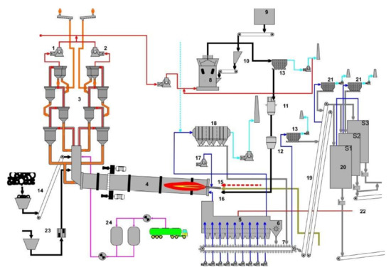 The scheme of the area where the cement factory is with a rotary cement kiln with clinker: 1. branch fan A; 2. branch fan B; 3. heat exchanger; 4. rotary cement kiln with clinker; 5. barbecue type cooler; 6. clinker crasher; 7.conveyers; 8. coal mill; 9. coal silo; 10. coal bunker; 11. milled coal silo; 12.proportioning system; 13. bag filter; 14. supply of used tires; 15.burner; 16.prefiring; 17. primary air fan; 18.electer filter; 19. conveyor belts; 20. clinker silos; 21. dust filters; 22. hot gas pipeline; 23. supply of oil sludge; and 24. NOx reduction installation.