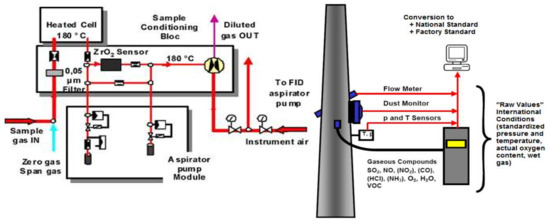 In the paper, the compounds (HCl, HF) were measured by sampling and analysis according to the standard method using an Advance Cemas FTIR monitoring system. This system is an emission monitoring system for several components simultaneously, such as HCl, HF, NH3, CO, NO, NO2, SO2, H2O, CO2, O2, and volatile organic compounds (VOC), if a flame ionization detector (FID) filter is integrated. The system consists of a TESTO 400 portable instrument for determining the temperature, humidity and dew point in the pipe; a BRAVO M Plus constant flow sampling pump for non-isokinetic sampling of HCl and NH3; and a TESTO 350 XL and TESTO 350 gas analyzer for determining the O2, NOx, CO, and SO2 values in the pipeline [40,41].