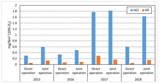 From Table 1 and Table 2, as well as from Figure 3, it is noted, however, that HCl and HF emission levels have increased during the analysis done in the last 2 years, which could be accounted for by the increasing quantities of waste used in the clinker kiln.