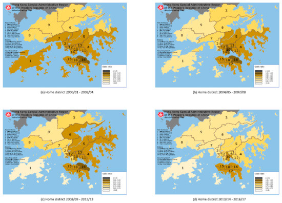 Figure 2. Map of 18 administrative districts in Hong Kong showing the adjusted odds ratio for reduced visual acuity by student’ s home district (17 districts relative to Central & Western District) during 2000/01–2003/04, 2004/05–2007/08, 2008/09–2012/13, and 2013/14–2016/17 (Modified map from original source: Wikimedia Commons (https://commons.wikimedia.org/wiki/File:Map_of_Hong_Kong_18_Districts_en.svg)).