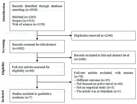 Figure 1 presents the flow citation through the systematic review process. The systematic search yielded 3938 publications. After excluding the duplicates (n = 2246), the title and abstract of 1692 articles were screened. After eliminating 1606 articles at the title and abstract level, 86 articles remained and were subsequently read. From the 86 articles, 35 were eliminated for having a different outcome, 40 were eliminated because they were not focused on active travel or active commuting, three were eliminated for not being empirical studies, and one was deleted because it was written in Mandarin. Thus, seven articles were identified as relevant.