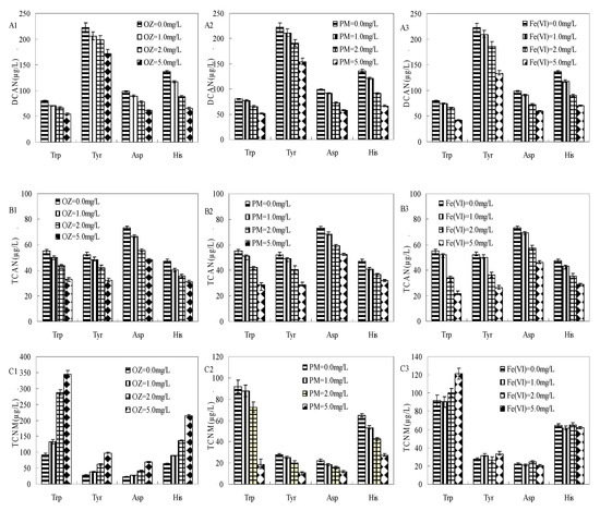 TCNM formation during 24 h post-chlorination of AAs after 30 min pre-oxidation is depicted in C1, C2, and C3 (Figure 2). OZ pre-oxidation and subsequent chlorination had a negative effect on TCNM formation. As the pre-oxidants dose increased from 0 to 5 mg/L, OZ pre-oxidation decreased the TCNM yields of Trp, Tyr, Asp, and His by −276.4%, −250%, −210%, and −232%, respectively, during subsequent chlorination. PM pre-oxidation decreased the TCNM formation by 79.6%, 61.9%, 45.7%, and 57.8%, respectively. However, Fe(VI) pre-oxidation had no obvious influence on the formation of TCNM. Compared with PM and Fe(VI), OZ might produce more TCNM by oxidizing amine groups to the nitro group [14,24].