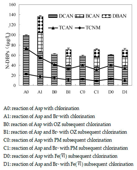 Figure 3 illustrates the effect of bromide on the formation of HAN and TCNM during pre-oxidation subsequent chlorination of Asp. Four HANs, including DCAN, BCAN, DBAN, TCAN, and TCNM, were detected. During the chlorination of Asp, as bromide concentrations increased from 0 to 1 mg/L, the total concentrations of dihaloacetonitriles (DHANs) increased from 98.7 to 136.4 μg/L, while the concentrations of TCAN and TCNM reduced. This might be the reason why their brominated substitutions were not detected, which was in agreement with the formation of brominated DBPs during chlorination of natural organic matter in the presence of bromide [43]. The presence of bromide shifted HANs to more brominated species and increased the concentration of the total HANs because bromine species were more effective substitution agents than the corresponding chlorine species [5]. Compared to the reaction of Asp with chlorination, it had a similar impact on the formation of HANs and TCNM during pre-oxidation subsequent chlorination of Asp in the presence of bromide.
