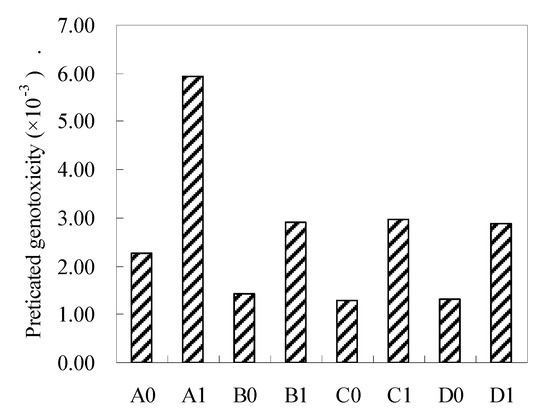 The predicted genotoxicity of the measured DBPs (i.e., HANs and TCNM) was calculated by dividing the measured concentration of DBPs by the published genotoxicity potencies in the Chinese hamster ovary (CHO) comet assay (4 h exposure). The genotoxicity is the dose required to elicit a toxic response in 50% of the cells (Table S2), which is a unitless value [1,31]. Similarly, the predicted cytotoxicity was calculated by dividing the measured concentration of DBPs by the published LC50 values. The cytotoxicity is the dose required to induce 50% viability of the cells for CHO cells (72 h exposure) and is represented in Table S3 [1,31].