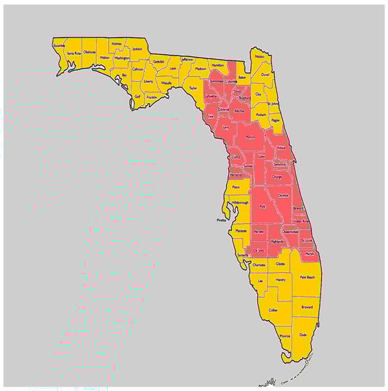 On 10 September 2017, Hurricane Irma made landfall in the Florida Keys as a level four hurricane. Later that same day, Hurricane Irma made landfall again in Southwest Florida as a level three storm. As a result of hurricane-force winds, rain, and flooding, more than 6 million residents were left without power [1] and were forced to deal with structural damage to their homes, property, and workplaces. In the aftermath, there were fuel, food, and construction material shortages, as well as extensive losses of fields, orchards, and livestock. The death toll was 123 [2], and the entire state of Florida was designated a disaster region with the most intensive Federal Emergency Management Agency (FEMA) activity directed to the counties identified in red in Figure 1. These regions represent the core of Florida’s agricultural industry, and the sustained estimated agricultural loss because of Hurricane Irma exceeded $2.5 billion [3]. This includes losses to Florida’s iconic citrus producers as well as sugarcane, avocado, dairy, and beef cattle operations, all of which will likely take years to recover fields, orchards, and livestock.