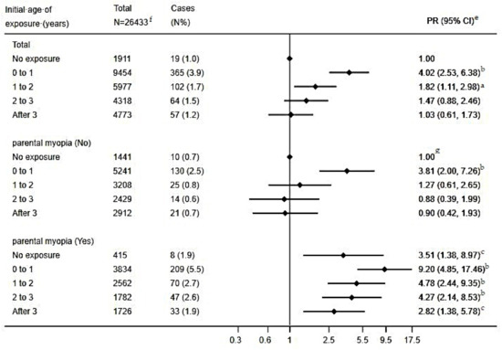 e: adjusted for children’s age, gender, feeding patterns, and premature birth; parental age at childbirth, education level, and monthly household income. f: children with parents having other eyesight disorders were not included in the analysis. g: This subgroup was the reference group for both children without/with parental myopia in the stratified analysis; a: p < 0.05; b: p < 0.001; c: p < 0.01.
