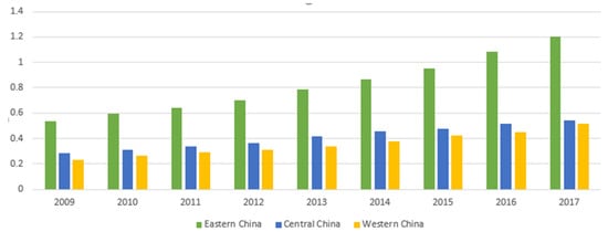After measuring the carbon emission data of each region, according to the definition of carbon productivity, this paper used the GDP data adjusted in 2009 as the base year to calculate the regional carbon productivity values. Considering the length of the article, this paper only lists the carbon productivity data of China’s eastern, central, and western areas for 2009 to 2017, as shown in Figure 1.