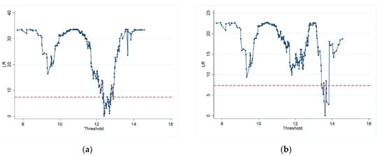 After checking the threshold effect, the likelihood ratio function graph can be used to see the threshold value when the technological innovation capability is the threshold variable, that is, the 95% confidence interval. In the double threshold model studied in this paper, the estimated thresholds are (shown in Figure 2a) and (shown in Figure 2b), and the likelihood ratio statistic is zero. The 95% confidence interval for each threshold estimate is the interval formed by all the threshold values (corresponding to the dashed line in the figure) where the LR value is less than 5% of the significance level and is verified by the threshold truth value. Therefore, according to the two thresholds, China’s regions can be divided into three types: the low-tech innovation interval (), the medium-tech innovation interval (), and the high-tech innovation interval ().