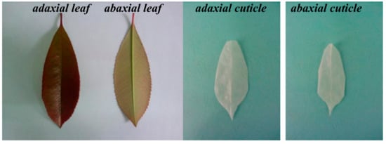 Mature leaves of Photinia serrulata (Figure 1) were collected on the campus of Southwest University of Science and Technology, China, and washed with distilled water to remove the dust from the surface. Cuticles were detached using the method described in an earlier report []. Then the air dried leaves were weighed and vertically cut in the main vein (in order to facilitate separation), put into the mixture of 30% H2O2 and glacial acetic acid at 1:1, and heated by a 60 °C water bath until the leaves faded into transparent (about 10 h). The abaxial and adaxial foliar cuticles were carefully peeled off by thin-tipped tweezers while being kept as intact as possible (Figure 1). The separated cuticles were stirred by using a magnetic stirrer to sufficiently remove the margins and mesophyll tissues, rinsed with distilled water again, heated at 60 °C, ground, sieved through a 100-mesh sieve, and kept separately as samples.