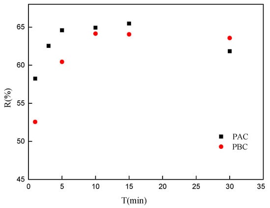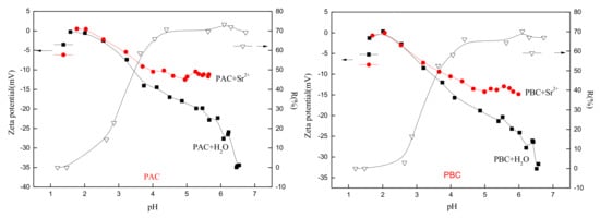 The correlation between the adsorption rate and the increase in zeta potential before and after Sr loading (ΔZeta) is shown in Figure 8. The positive correlation between the adsorption rate and increases in zeta potential was exhibited, indicating that the key mechanism of adsorption was electrostatic attraction and complex reaction rather ion exchange. The increase in zeta potential represented the growth of the surface charges of the adsorbent, and the ion exchange was an equal value exchange that would not change the amount of surface charges. Hence, the reason why the amount of (negative) charges was reduced after the adsorption was that part of the negative surface charges were counteracted by the electrostatic attraction and complex reaction with the cations.