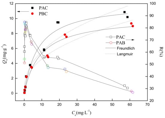 where is the amount sorbed per unit weight of sorbent (mg·g−1); is the equilibrium concentration (mg·L−1); Langmuir (mg·g−1) is the maximum sorption amount per unit weight of sorbent, and indicates the affinity between adsorbent and adsorbate, as the greater the , the greater the affinity; [(mg/g)/(mg/L)N] is the Freundlich capacity coefficient, and N (dimensionless) describes the isotherm curvature.