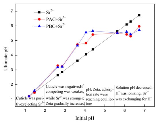 The effect of pH on the adsorption behavior of adaxial and abaxial cuticles is shown in Figure 6, and the initial and final pH values of adsorption working solution are also shown in Figure 7. Considering the significance of surface charge properties on metal ion sorption behavior [], the corresponding zeta potential of cuticle particles with and without Sr loading was also determined (Figure 6). Ionization and protonation of the functional group (such as -O-, -OH, =O, -COOH, -NH2) of cuticle particles surface directly changes upon interaction with H+ or OH− with the various pH values, resulting different zeta potential [].