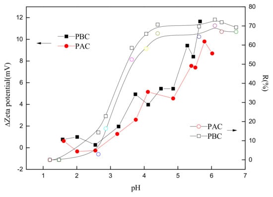 Relationship of removal rate and the change of zeta potential of cuticle before and after Sr adsorption by adaxial (PAC) and abaxial (PBC) cuticle of Photinia serrulata Leaf.