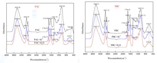 The infrared spectrum of the abaxial and adaxial foliar cuticles of Photinia fraseri is shown in Figure 9. The characteristic functional groups in the abaxial and adaxial foliar cuticles did not change importantly before and after the adsorption for Sr, suggesting that there was no chemical precipitation in the adsorption of cuticles for Sr. For PAC, after Sr were adsorbed, the peaks at 2926, 2856, 1736, 1464, 1421, 1246, 1164, and 1062 cm−1 were intensified, showing that C-H, -COOH, and C-O-C were all involved in the adsorption; while the peak at 1629 cm−1 moved towards the low wave-number to 1626 cm−1, following Sr adsorption, the H+ in carboxyl groups were replaced, causing a decline in the vibration intensity of the C=O bond and a reduced wave number at the maximum adsorption peak. For PBC, the peak intensities almost remained unchanged, but the one at 1464 cm−1 moved towards the low wave-number by 4 cm−1, while those at 2927, 1629, and 1062 cm−1 moved towards the low wave-number by 1–2 cm−1, showing that C-H, phenolic hydroxyl group, and C-O-C might have undergone ligand complexation and ion exchange with Sr.
