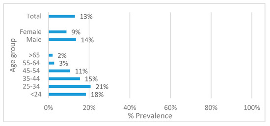 Oral leukoplakia was more prevalent in females (56%) as compared to males (44%, p = 0.001, Table 2), with total prevalence of 2.4%. There was an association between age group and prevalence of oral leukoplakia (p < 0.001), with participants aged 25–34 presenting the highest prevalence (35%, Figure 4).