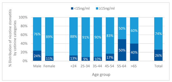 Distribution of nicotine stomatitis according to serum cotinine categories (<15 ng/mL and ≥15 ng/mL) in relation to sex (p = 0.03 for males, p < 0.001 for females), age group (p = 0.009 for 25–34, p = 0.002 for 35–44 and p = 0.001 for 45–54), and total (p < 0.001).